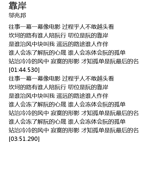 | [02:22.570] | 坎坷的路有谁人陪阮行 叨位是阮的靠岸 |