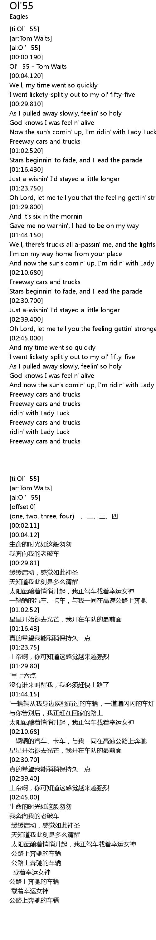 | [02:51.600] | I went lickety-splitly out to my ol' fifty-five |