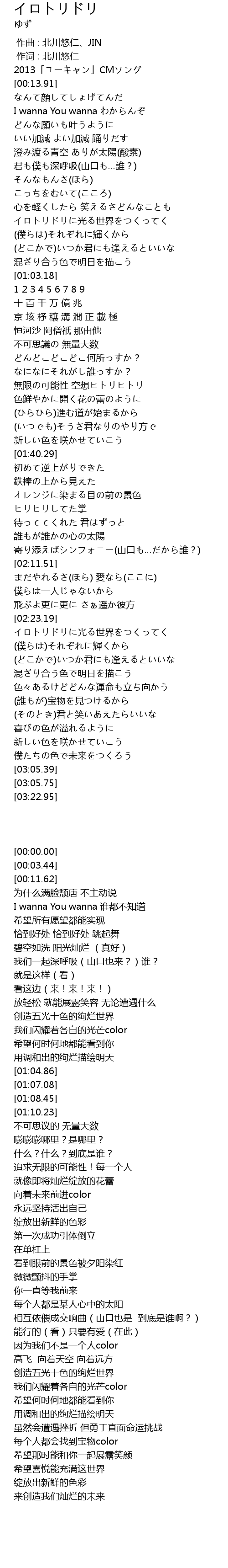 | [00:46.82] | イロトリドリに光る世界をつくってく |