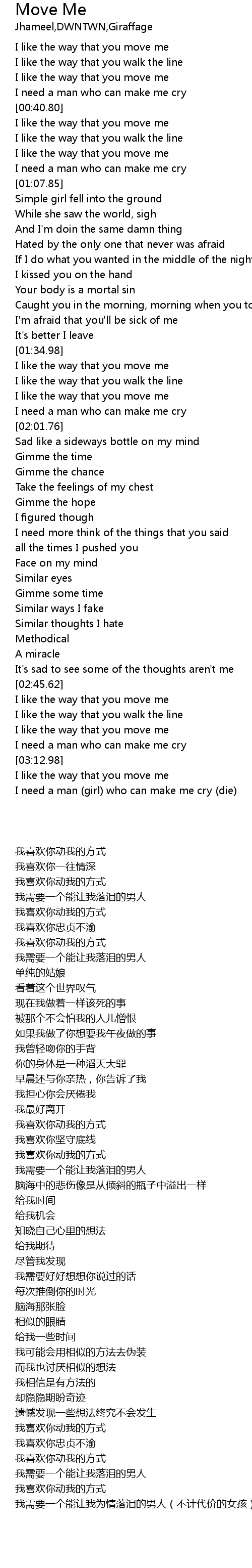 | [03:19.41] | I need a man (girl) who can make me cry (die) |