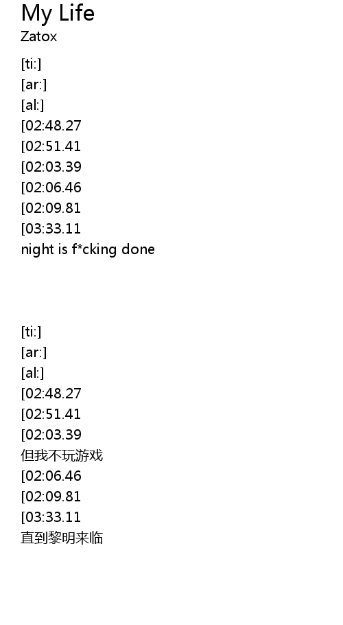 | [03:01.06][02:09.81][00:27.42] | This is my life, my life, my life |