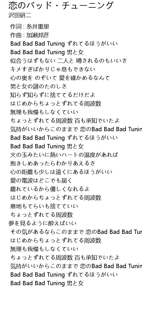 | [03:12.977] | 気持がいいからこのままで 恋のBad Bad Bad Tuning |