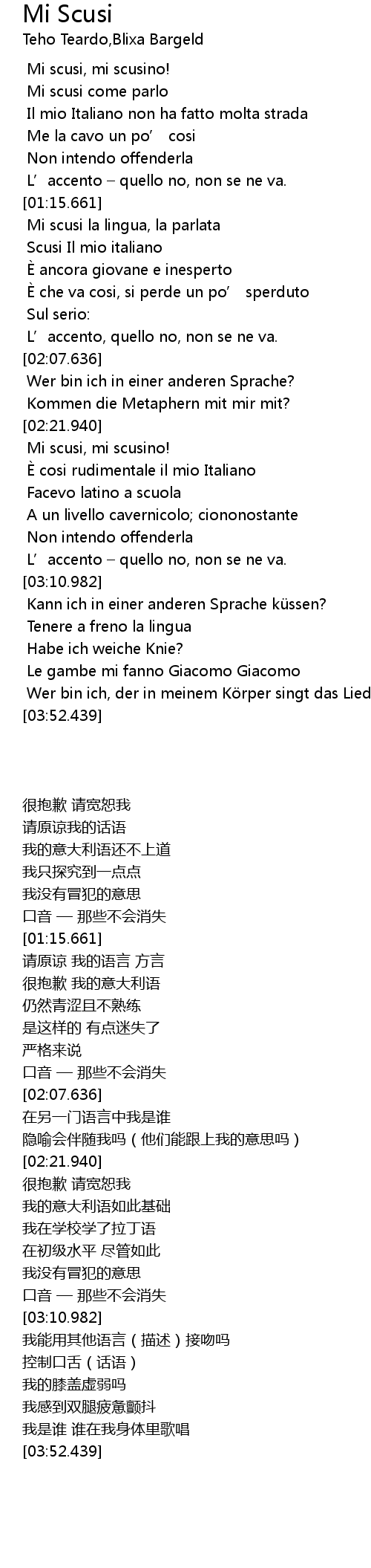 | [01:29.063] | Mi scusi la lingua, la parlata |