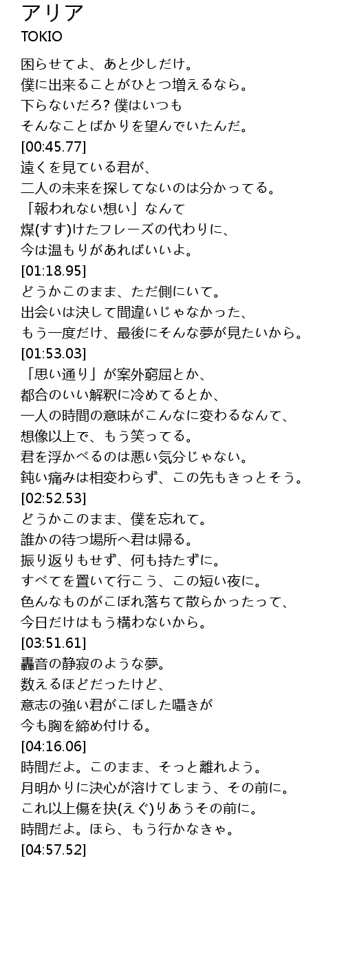 | [04:20.86] | 時間だよ。このまま、そっと離れよう。 |