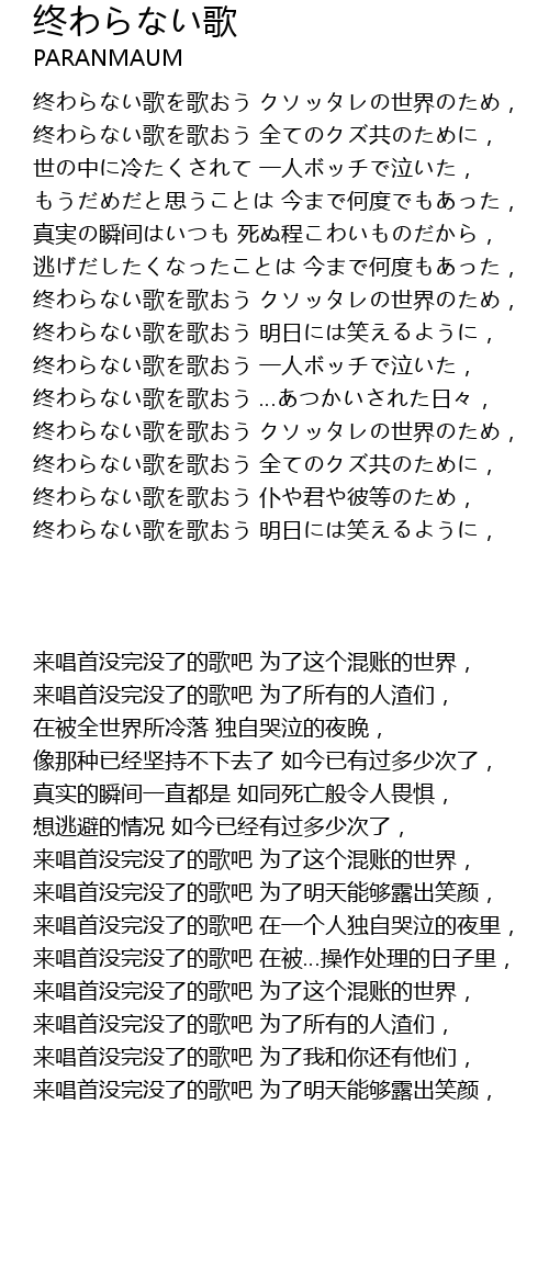 | [00:44.694] | 终わらない歌を歌おう クソッタレの世界のため, |