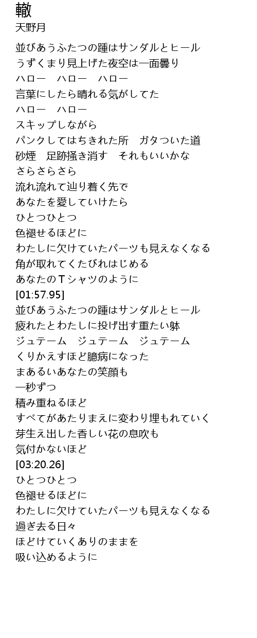 | [00:19.19] | 並びあうふたつの踵はサンダルとヒール |