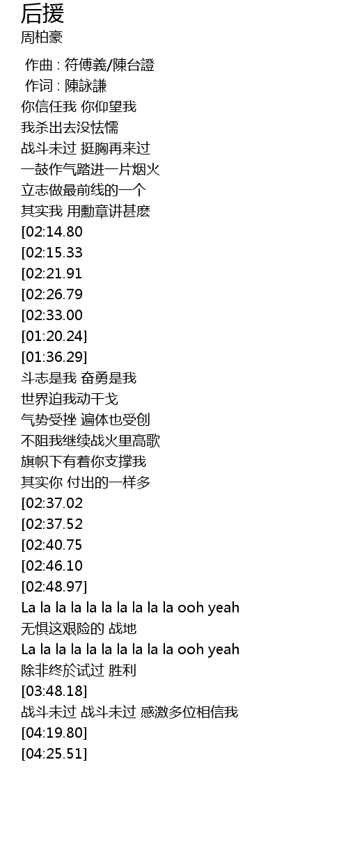| [03:17.78][02:21.91][01:03.92] | 无惧这艰险的 战地 |