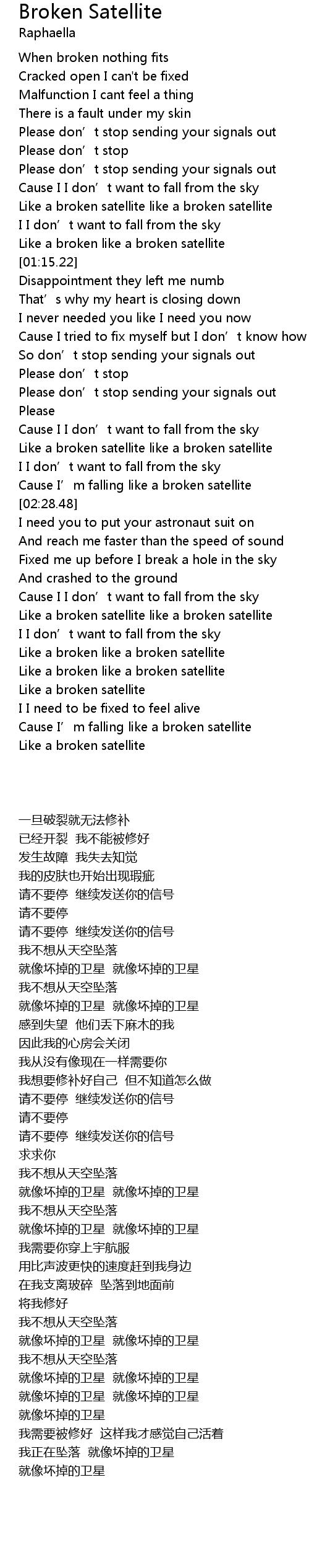 | [02:18.11] | Cause I’m falling like a broken satellite |
