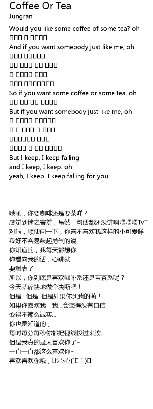 | [00:10.73] | Would you like some coffee of some tea? oh |