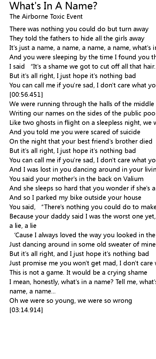 | [02:52.318] | I mean, honestly, what' s in a name? Tell me, what' s in a name, a name, a name... |