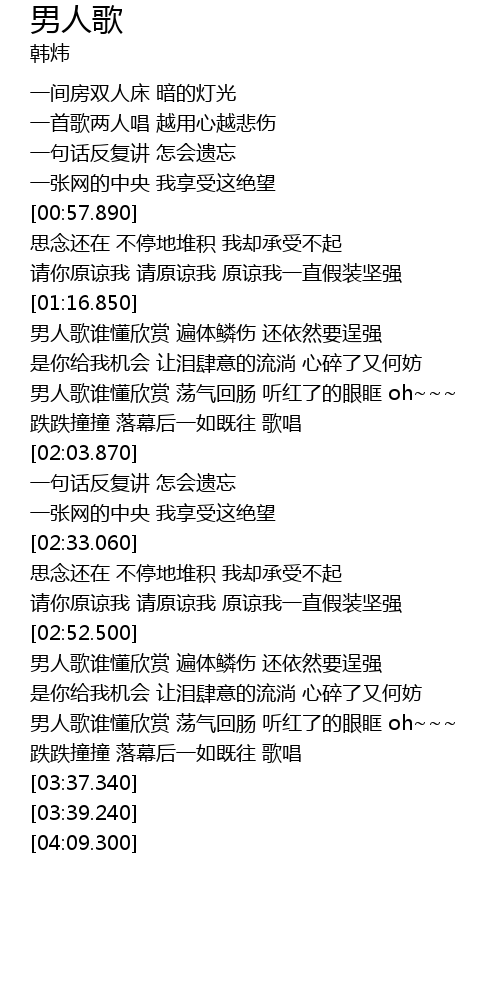 | [01:39.690] | 男人歌谁懂欣赏 荡气回肠 听红了的眼眶 oh~~~ |