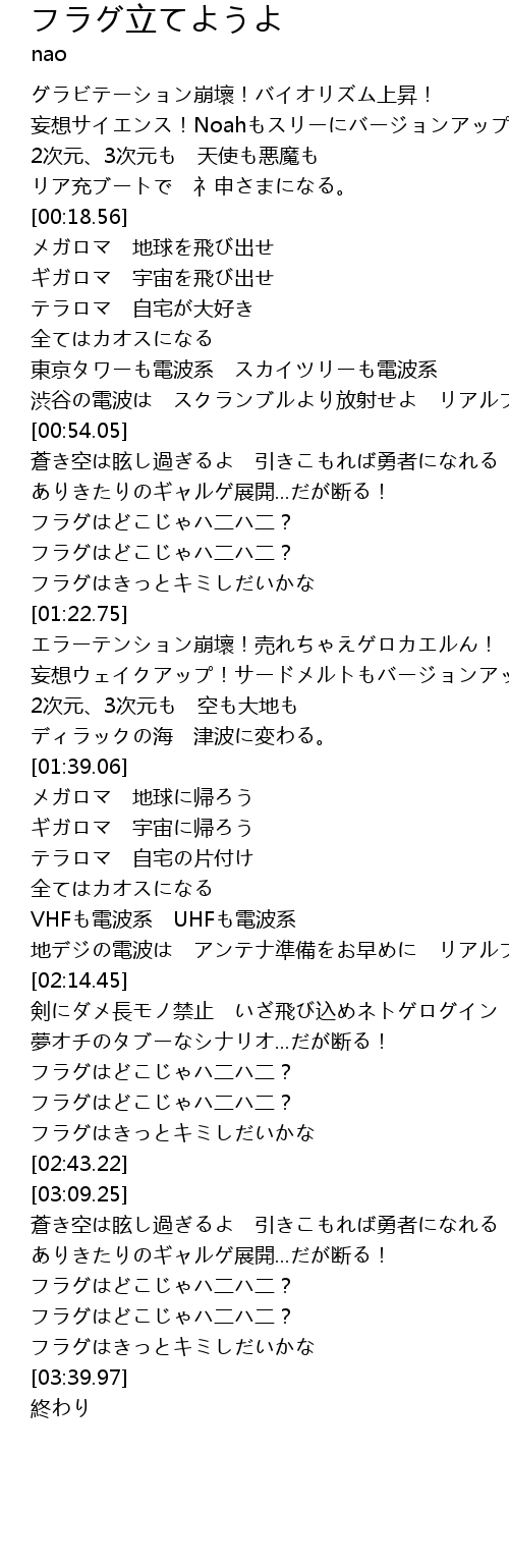 | [02:38.24] | フラグはきっとキミしだいかな |