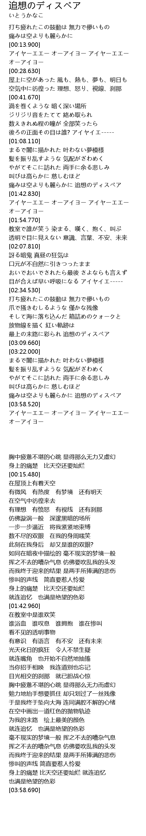 | [01:54.910] | 教室で誰が笑う 染まる、嘆く、抱く、叫ぶ |