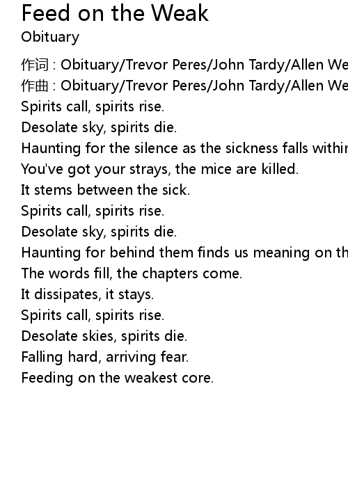 | 作词 : Obituary/Trevor Peres/John Tardy/Allen West/Frank Watkins/Donald Tardy | |