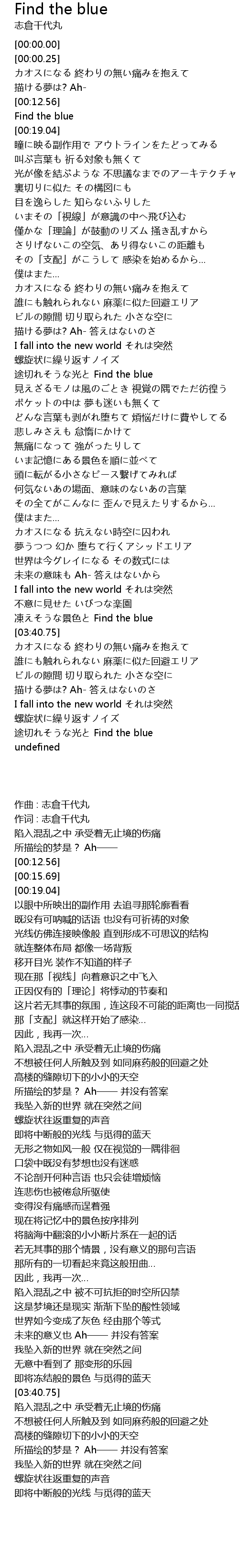 | [03:29.00] | 凍えそうな景色と Find the blue |