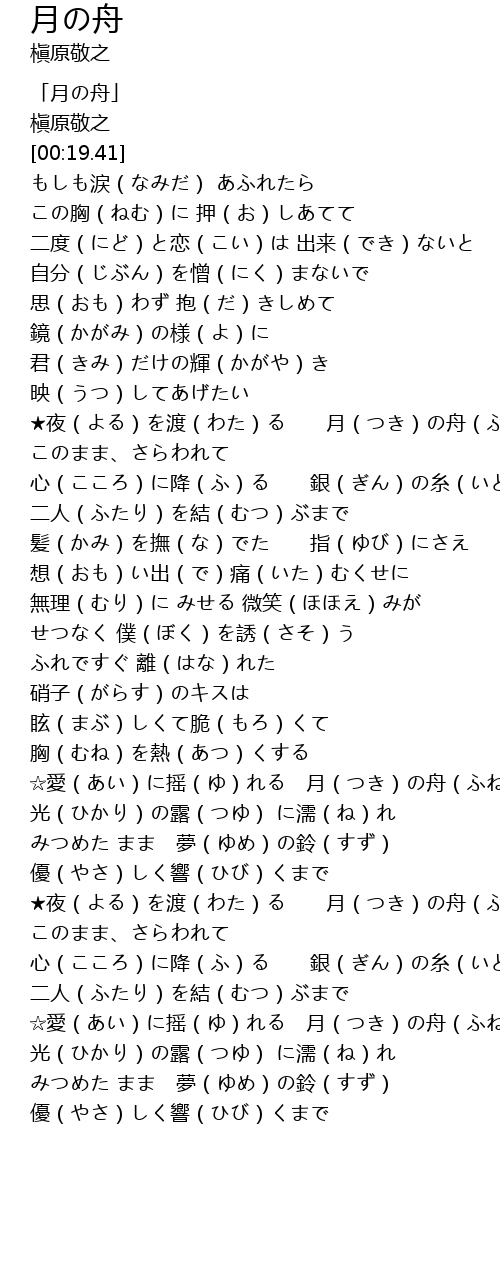 | [04:10.26] | ☆愛(あい)に摇(ゆ)れる 月(つき)の舟(ふね) |