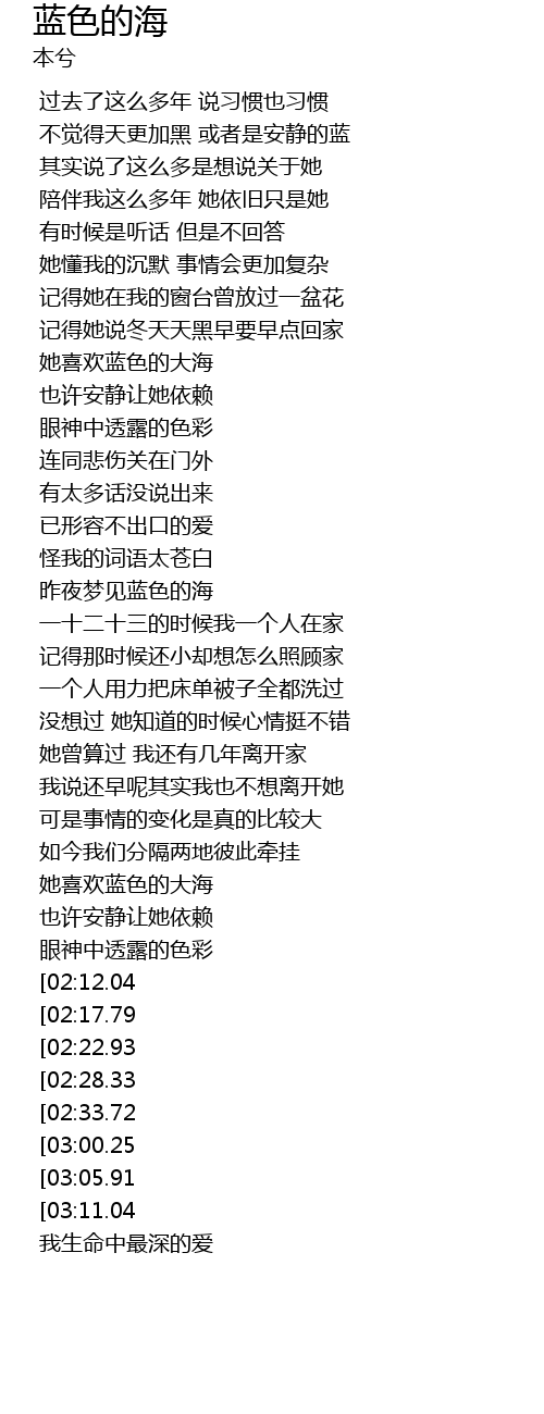 | [03:43.01] [03:00.25] | 她喜欢蓝色的大海 |