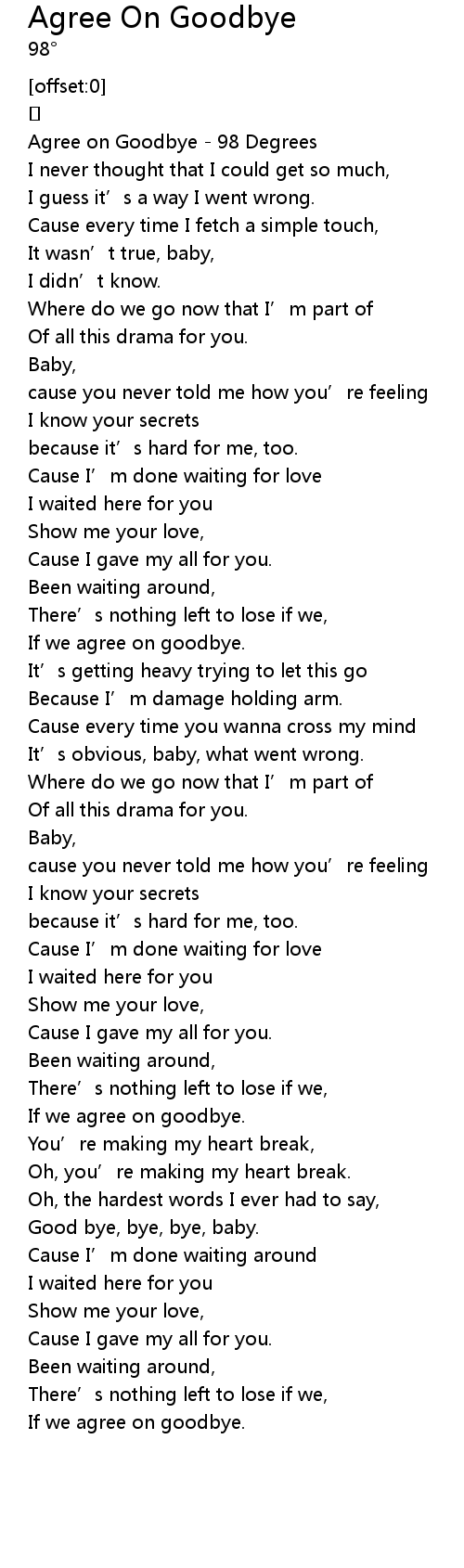 | [00:01.246] | Agree on Goodbye 98 Degrees |
