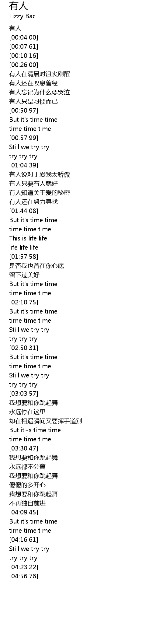 | [01:28.67] | yǒu rén zhǐ yào yǒu rén jiù hǎo |