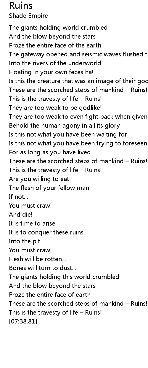 | [03:39.80] | These are the scorched steps of mankind Ruins! |