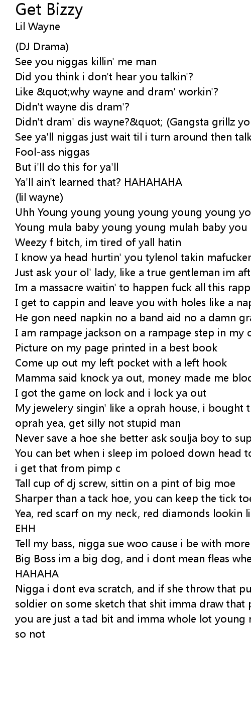 | Nigga i dont eva scratch, and if she throw that pussy, big dog fetch type of soldier on some sketch that shit imma draw that pistol make your chest a tablet you are just a tad bit and imma whole lot young money motherfucka but the money so not |