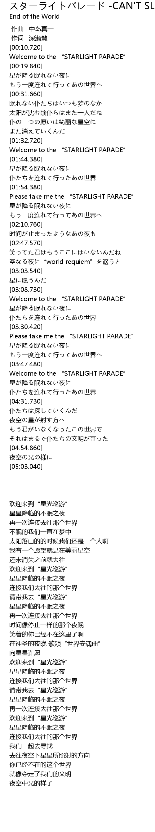 | [03:31.790] | Please take me the “STARLIGHT PARADE” |