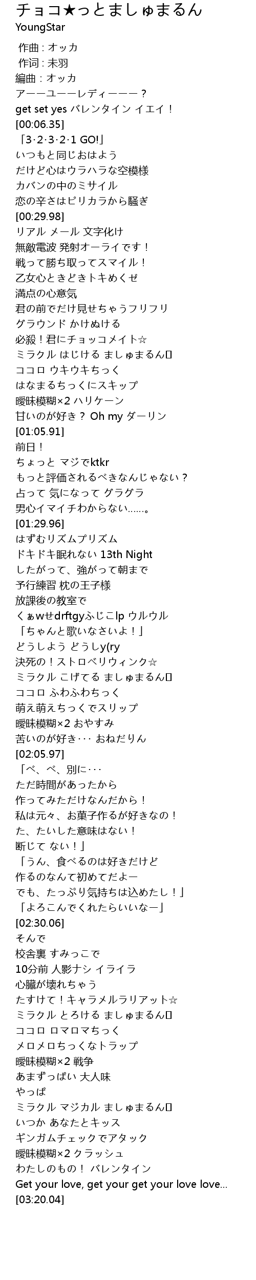 | [02:55.65] | ミラクル マジカル ましゅまるん♪ |