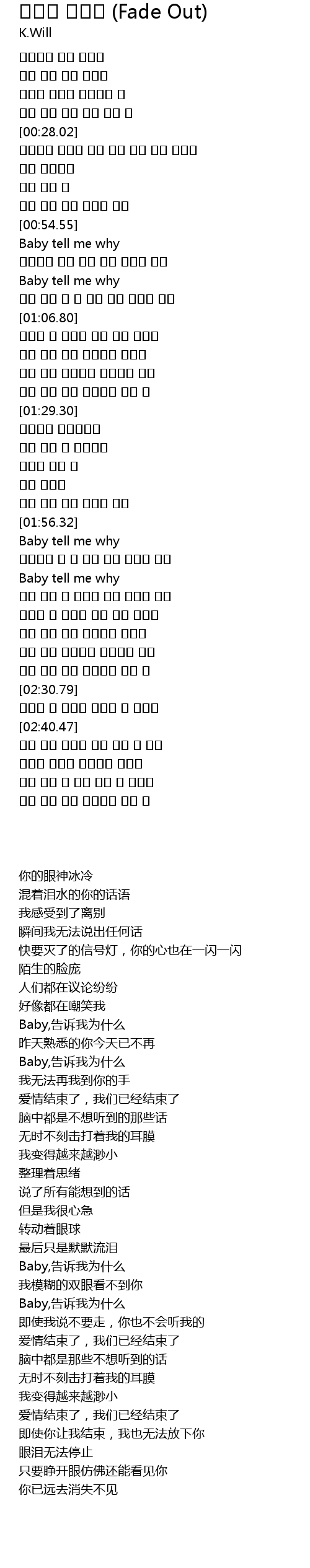 | [02:08.97] | 사랑은 다 끝났대 이미 우린 끝났대 |