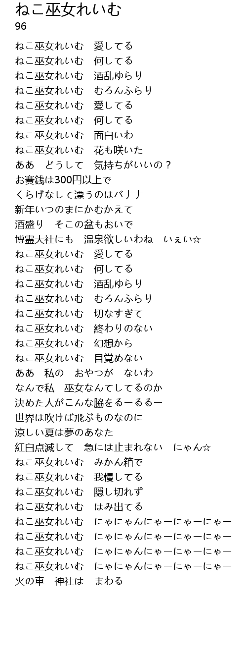 | [02:38.77] | ねこ巫女れいむ にゃにゃんにゃーにゃーにゃー |