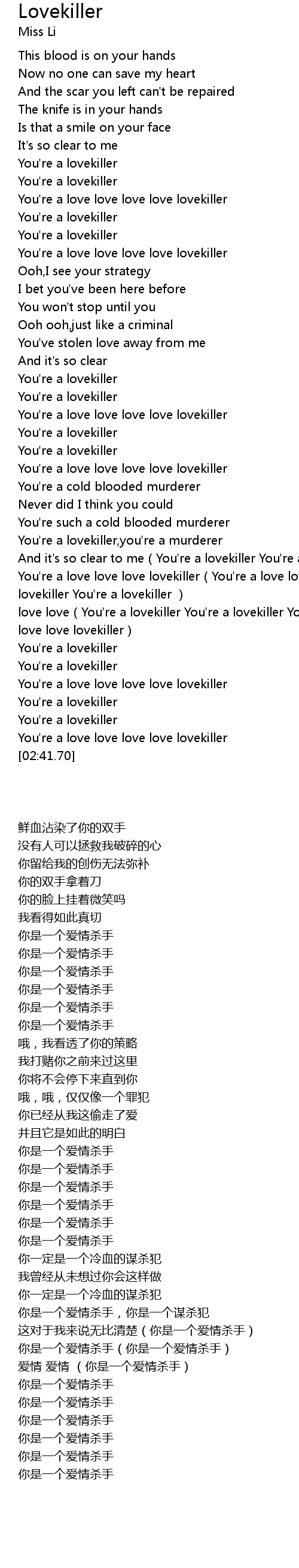 | [02:17.72] | love love(You're a lovekiller You're a lovekiller You're a love love love love lovekiller) |