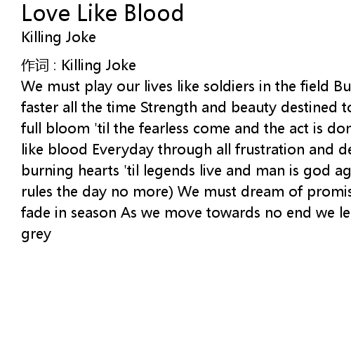 | We must play our lives like soldiers in the field But life is short i' m running faster all the time Strength and beauty destined to decay So cut the rose in full bloom ' til the fearless come and the act is done A love like blood, a love like blood Everyday through all frustration and despair Love and hate fight with burning hearts ' til legends live and man is god again and selfpreservation rules the day no more We must dream of promised lands and fields That never fade in season As we move towards no end we learn to die Red tears are shed on grey |