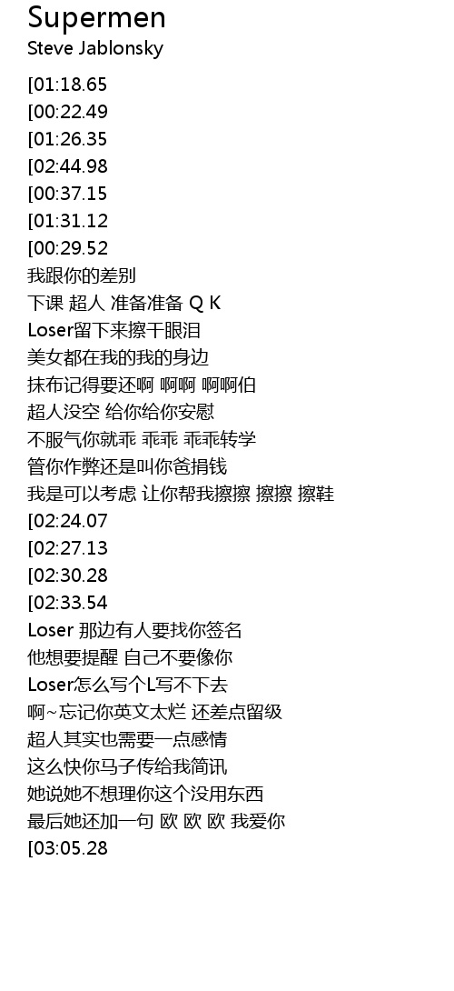 | [02:43.24][02:44.98][02:46.60][02:56.66][02:58.16][02:59.60] | year wo shi superman |