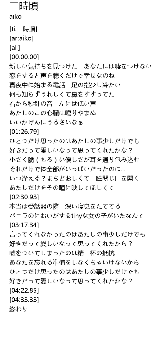 | [00:41.39] | 真夜中に始まる電話 足の指少し冷たい |