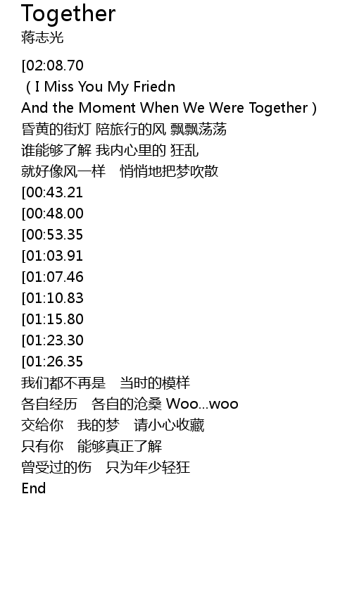 | [03:02.56][01:10.83] | (Together) 打开往事的行囊 |