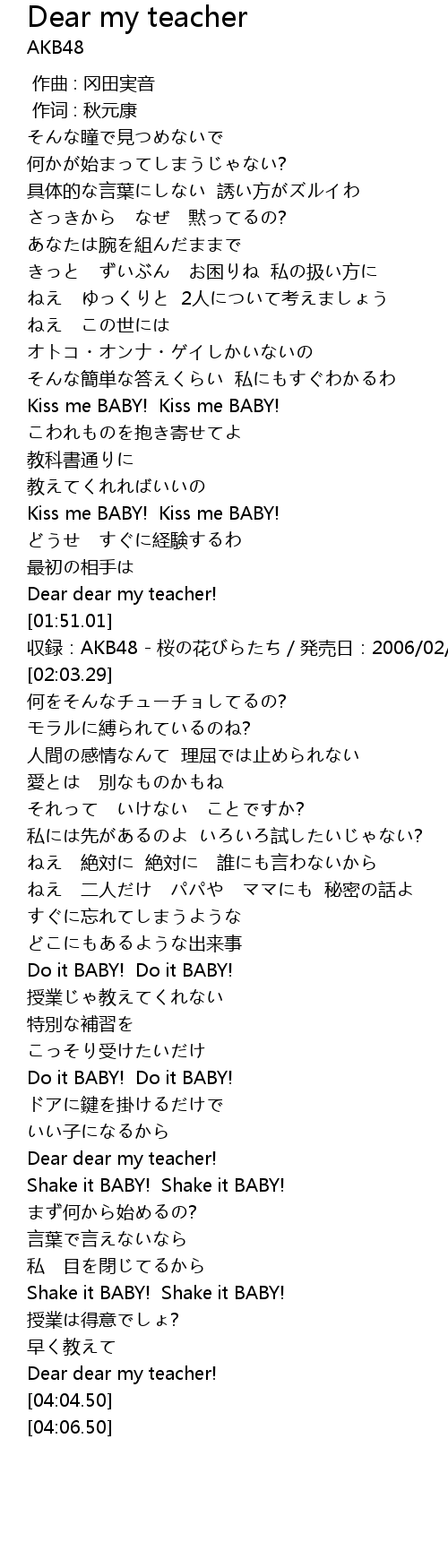 | [01:53.01] | 収録:AKB48 - 桜の花びらたち/発売日:2006/02/01 |