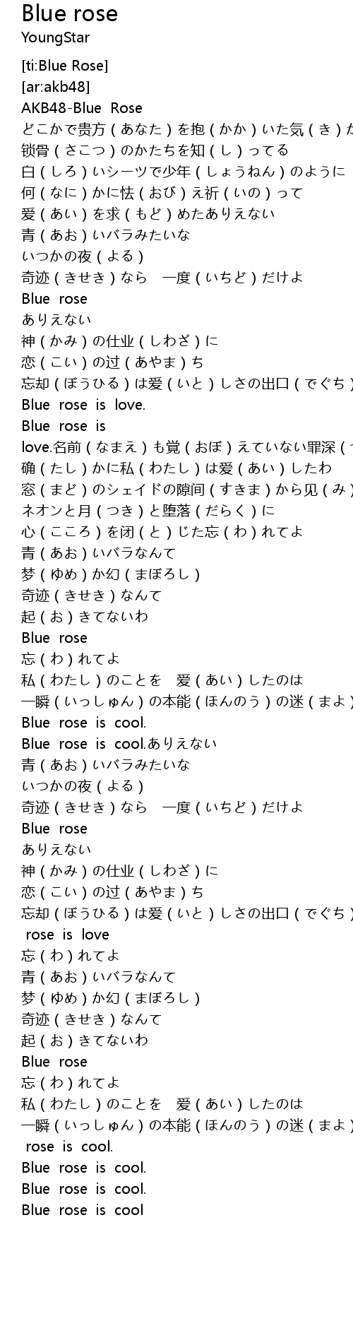 | [01:06.638] | Blue rose is love.名前(なまえ)も覚(おぼ)えていない罪深(つみぶか)さ |