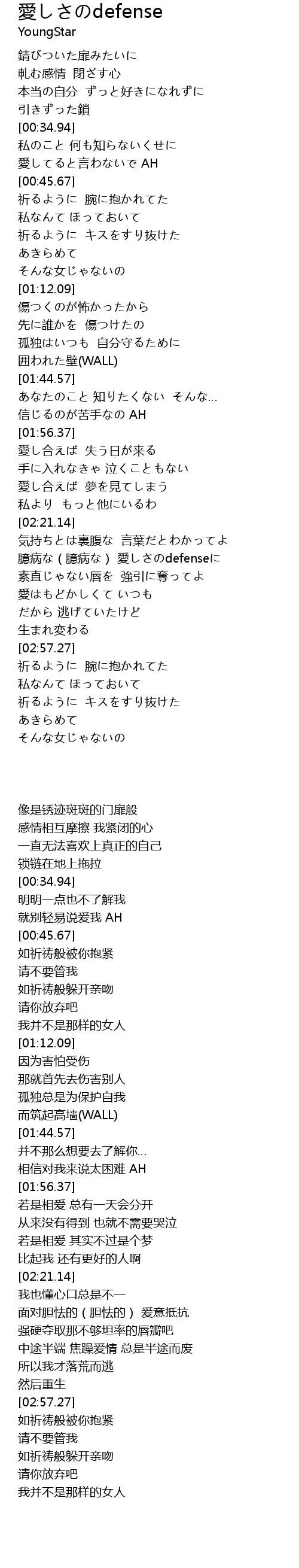 | [02:33.88] | 臆病な(臆病な) 愛しさのdefenseに |