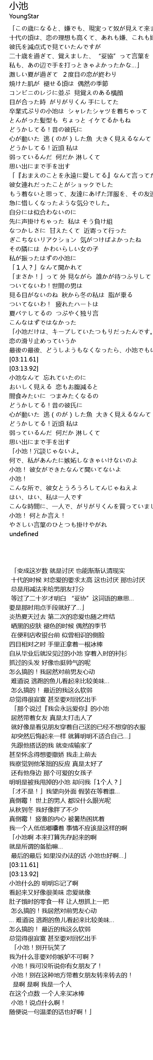 | [02:59.66] | 「小池だけは、キープしていたつもりだったんです。 恋の滑り止めっていうか |