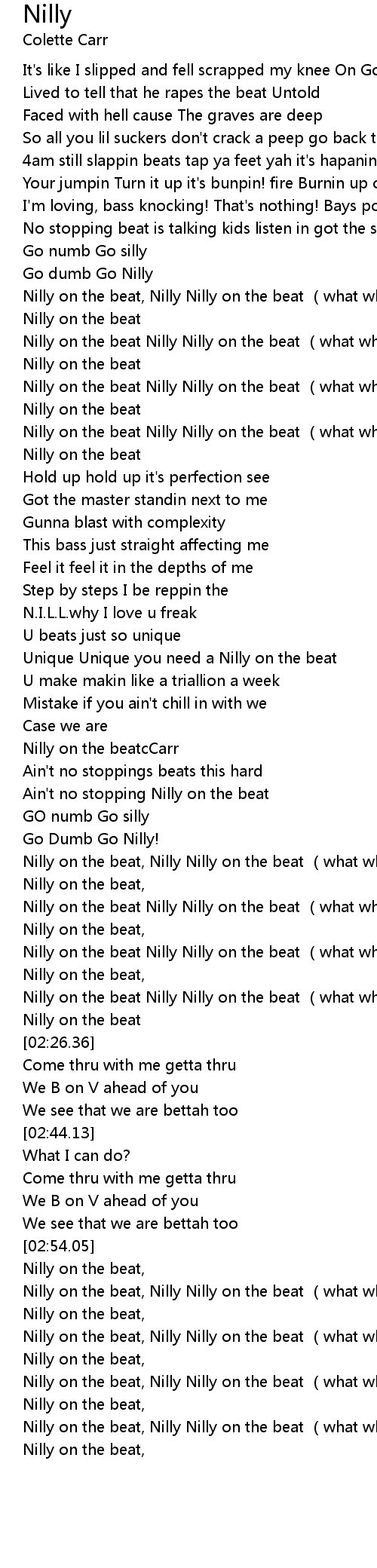 | [02:56.87] | Nilly on the beat, Nilly Nilly on the beat what what what |