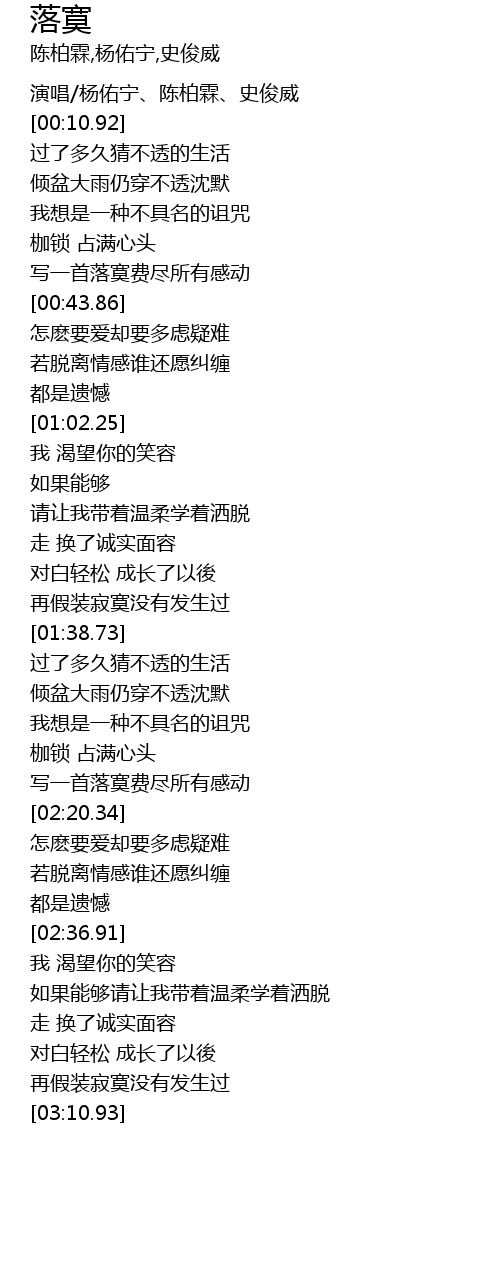 | [00:38.15] | 写一首落寞费尽所有感动 |