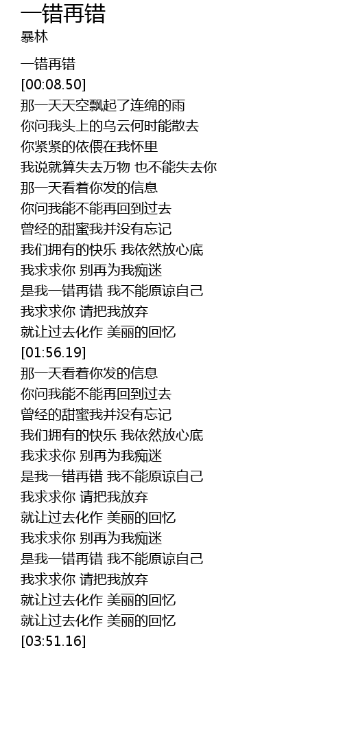 | [02:51.27] | shi wo yi cuo zai cuo wo bu neng yuan liang zi ji |