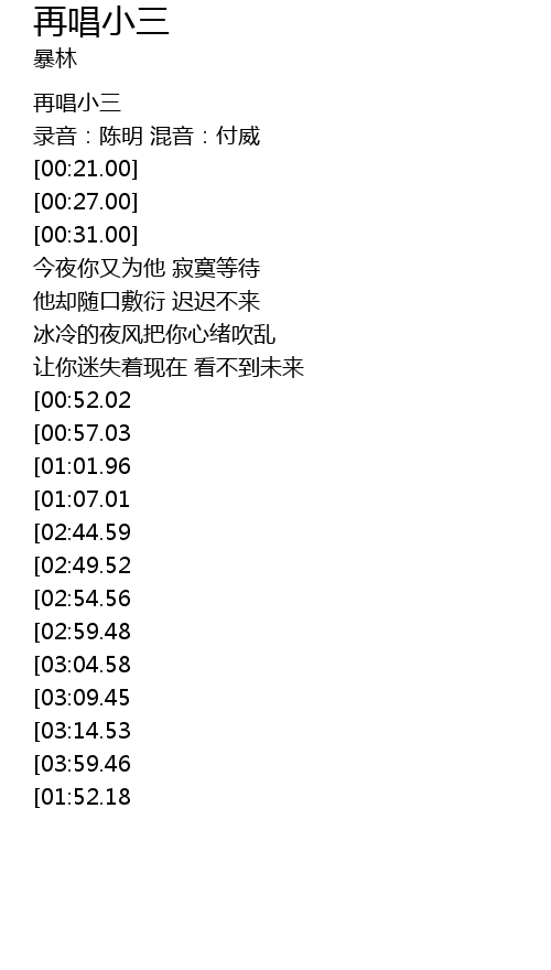 | [03:44.54][03:04.58][01:32.03] | 别说沦为小三是无奈 |