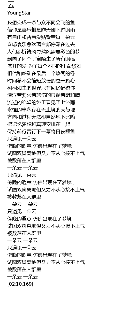 | [00:15.250] | 我想变成一条与众不同会飞的鱼 |