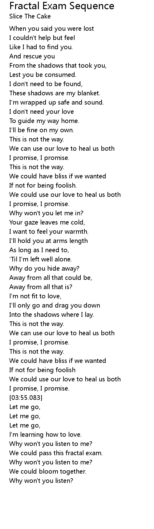 | [02:03.361] | Why won't you let me in? |