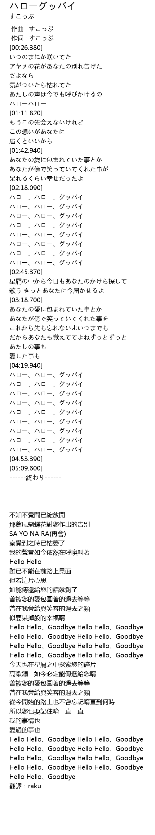 | [04:27.590] | ハロー、ハロー、グッバイ ハロー、ハロー、グッバイ |