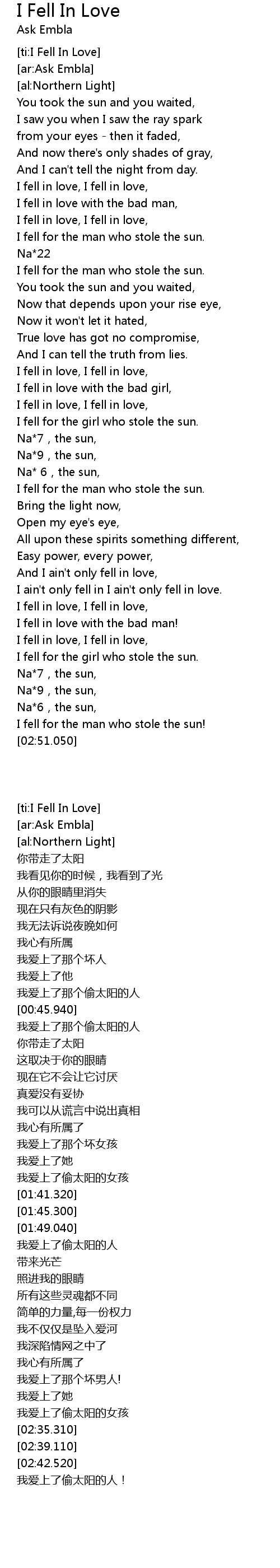 | [02:31.490] | I fell for the girl who stole the sun. |