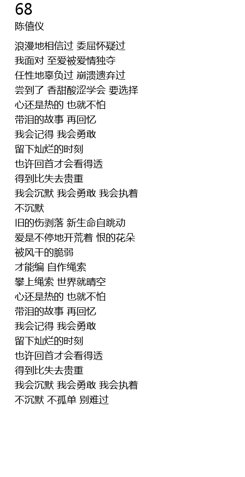 | [02:03.74] | wǒ huì chén mò wǒ huì yǒng gǎn wǒ huì zhí zhuó |