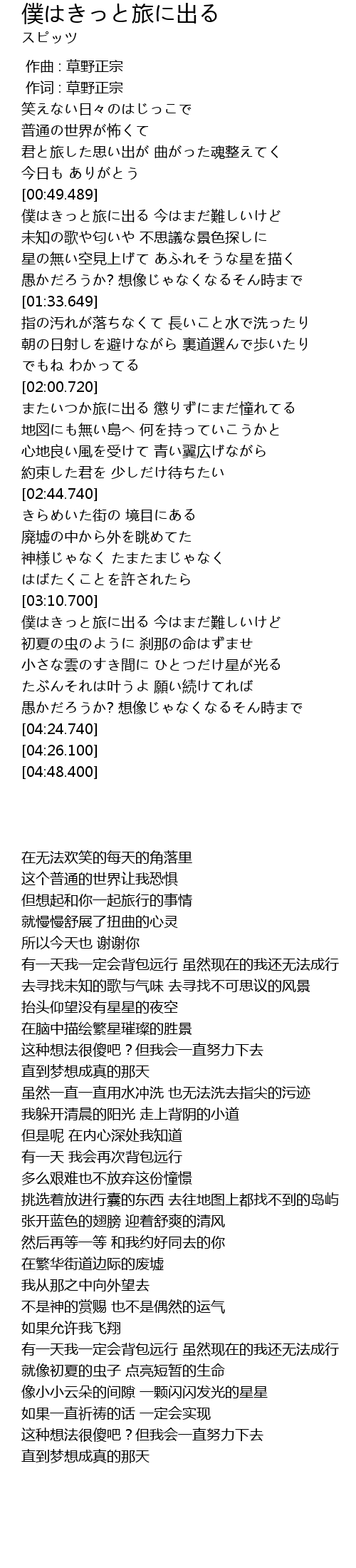 | [00:50.490] | 僕はきっと旅に出る 今はまだ難しいけど |