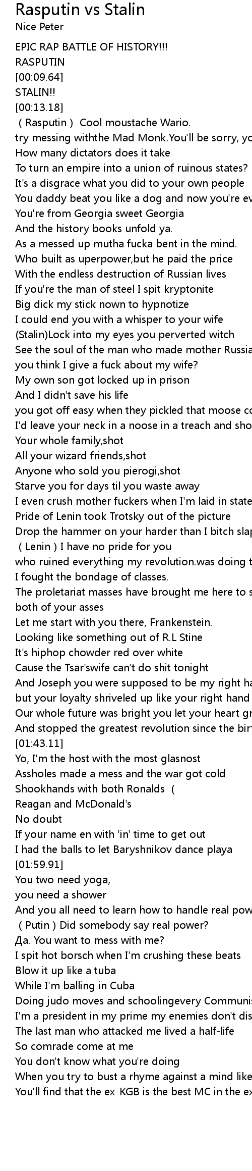 | [00:43.22] | See the soul of the man who made mother Russia his bitch |