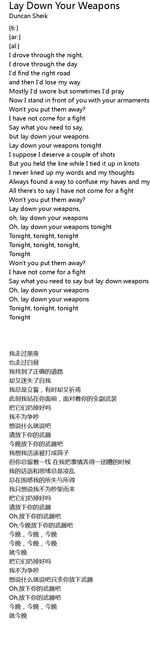 Oh, lay down your weapons tonight |